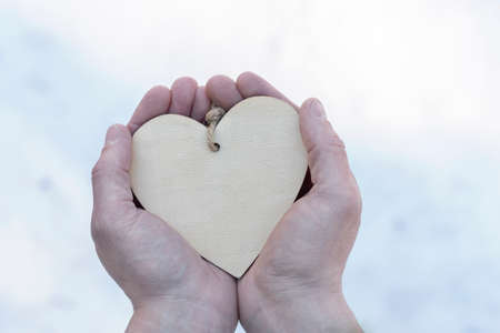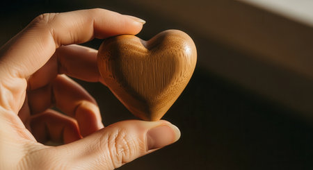 Woman hand delicately holds a smooth, light brown wooden heart, illuminated by soft natural light. represents love, care, and human connection.