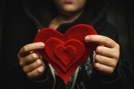 child with a red heart on a dark background. the boy holds the symbol of good and life. concept of helping those in need