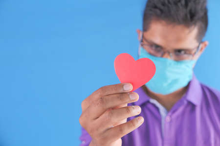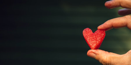 Gentle hands carefully hold a vibrant red textured heart shape, symbolizing love, care, health, and compassion, set against a soft pastel blue background.