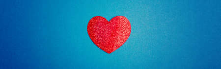 Happy Valentine Day. Beautiful card wallpaper with small red heart in centre on blue background. Concept of love February holiday. Web banner header for website.