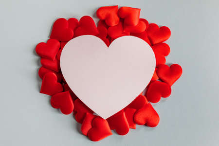 Valentine's day many red silk hearts and heart shaped white card on gray background, love concept