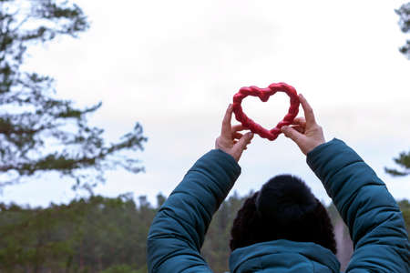 Heart of red threads of yarn in female hands on a light background. Valentines Day
