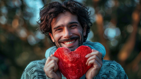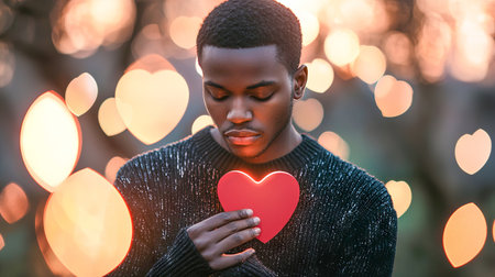 African American Man Holding a Heart Symbol in a Bokeh Background. Concept of Love, Romance, Emotional Connection, and Valentine's Day Celebration.