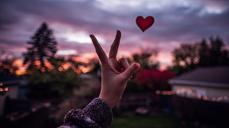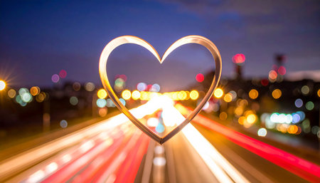 Two hands forming a heart shape against a backdrop of twinkling city lights. High quality illustration