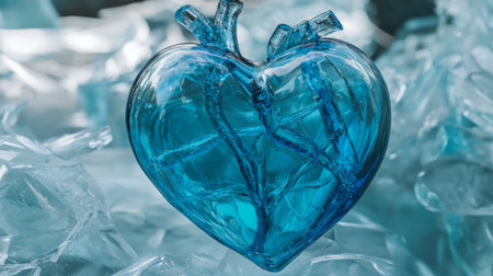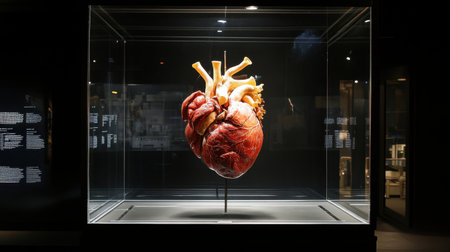 A detailed preserved heart displayed in a glass case highlights the intricacies of human anatomy. This striking exhibit merges art and science in a museum setting.