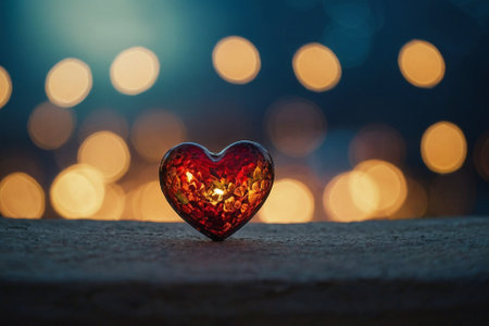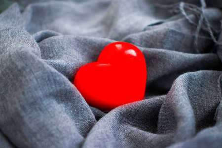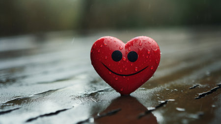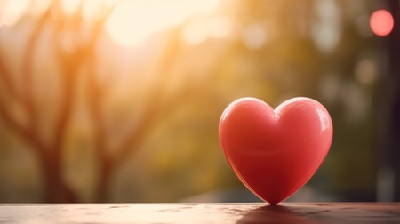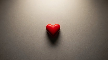 A small red heart sitting on a gray surface, casting a subtle shadow. The heart is centered in the frame and illuminated from above, creating a sense of depth and dimension. Clear details and vibrant colors enhance visual appeal.