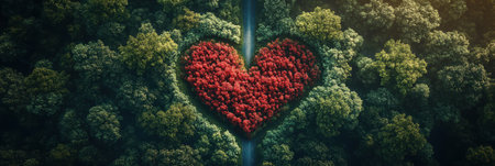 Heart-shaped garden nestled within a vibrant green forest during daylight in a picturesque natural setting