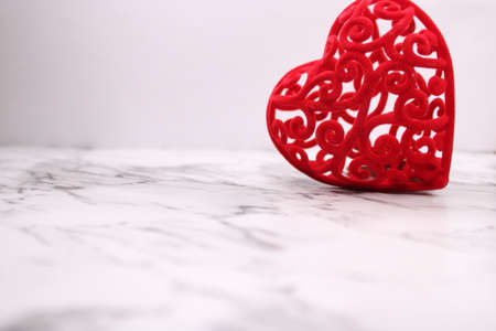 Conceptual light gray marble background for Valentine's Day with red heart with space for text.