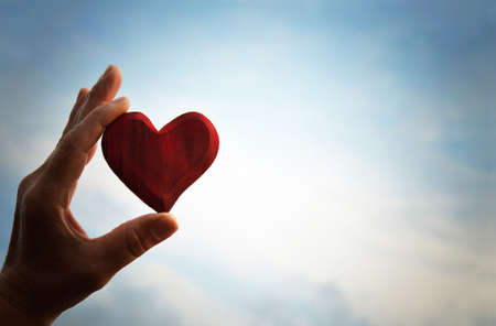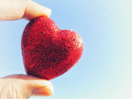 red heart in children's hands on sky background, concept of love. Symbol of love and family.Valentines day card. Mother's day. Backgrounds for social posters. Selective focus.