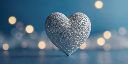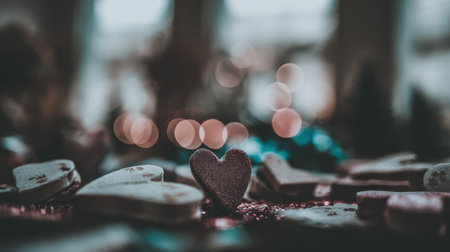 A single heart-shaped cookie stands out on a table, surrounded by other heart shapes and blurred lights.