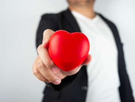 A man wearing a black suit Put a red heart in front Express love on valentine's day