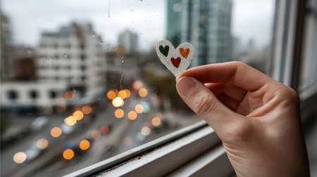 A hand holds a small paper heart cutout against a rainy window, creating a tender scene with blurred city lights in the background, evoking feelings of love and warmth.
