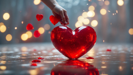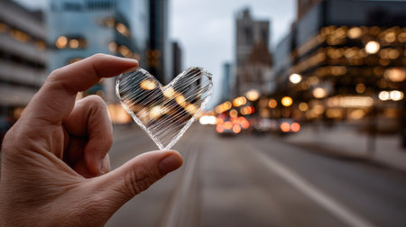 A delicate glass heart held in hand captures the essence of love and connection amidst a bustling cityscape, evoking feelings of warmth and beauty.
