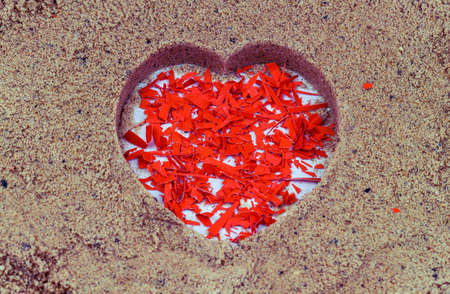 love concept image of heart shape made of colorful confetti on blue paper texture background