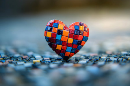 Close up of a colorful mosaic heart resting on a similar blurred mosaic surface, creating a vibrant and romantic image