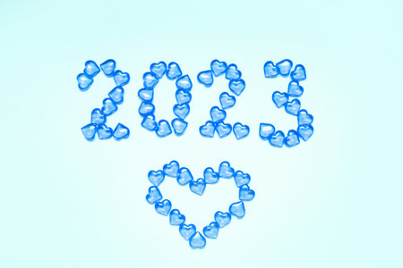 New Year 2023 inscription from glass hearts on a blue background. color 2023. Idea and creativity. Valentines Day. Christmas with loved ones. Horizontally, banner. High quality photo