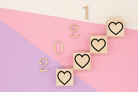 Wooden cubes with the date of February 14 and heart in the center. Valentine's Day celebration