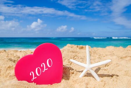 Symbol from number 2020 on the big heart with starfish on the sandy beach in Hawaii, Kauai
