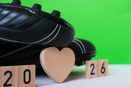 Symbolic wooden heart and numbers 2026. Black football cleat with spikes on a green background. Soccer fans concept. Shallow depth of field. Copy space.