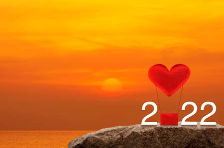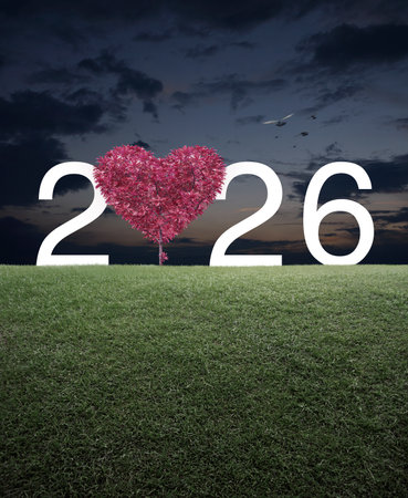 Red tree in the shape of heart love with 2026 white text on green grass field over sunset sky with birds, Happy New Year and Valentines day 2026 cover concept