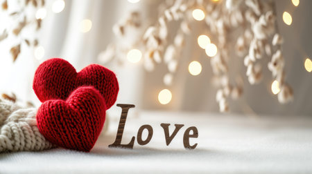 inscription Love alongside two vibrant red hearts on a light background, emphasizes clean lines and contemporary aesthetics to convey the simplicity and beauty of love