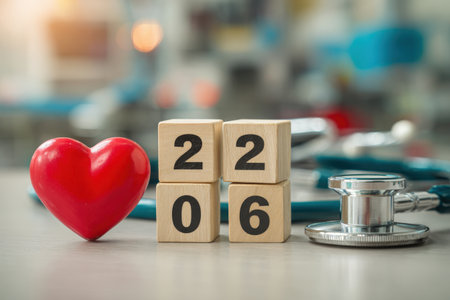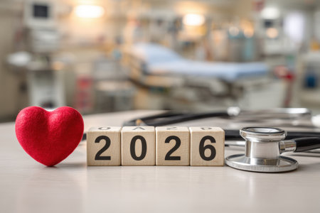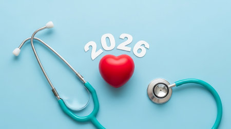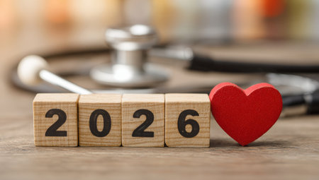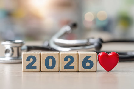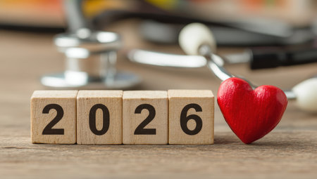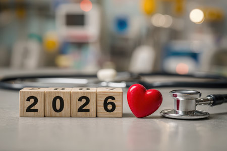 Blocks showing the year 2026 and a heart symbol are placed on a table in a medical setting. A stethoscope is visible, symbolizing health and optimism as the new year begins