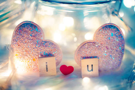 wooden letter block and heart shape on white cloth and light decorative bokeh. Love, Valentine and holiday concept.