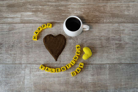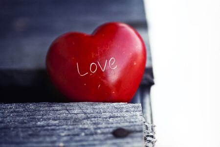 Valentine Day Card Concept. Creative Idea. Love message written in wooden blocks and ceramic red heart on old wooden background.