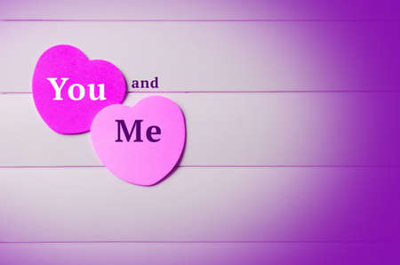 two paper hearts with the inscription You and I on a gradient ultraviolet striped background