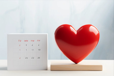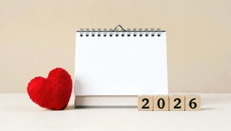 Blank calendar with wooden 2026 blocks and red heart on table.