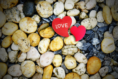 A close-up view of numerous small wooden hearts, mostly pale and natural wood, with two vibrant red hearts prominently placed in the center.