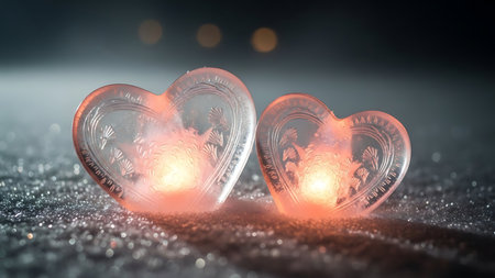 Two heartshaped candles emitting a soft glow placed on a sparkling glittery surface creating a romantic and cozy atmosphere