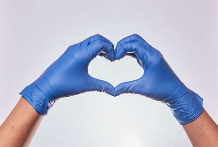 nitrile gloves for medicine making heart shape. isolated on white background. Man's hands in nitrile gloves representing emotions.