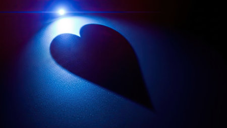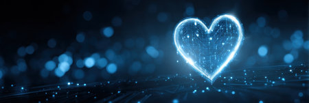 A bright clean heart icon shines vividly against a digital abstract backdrop filled with blue lights, creating a joyful and modern atmosphere.