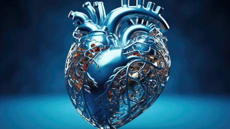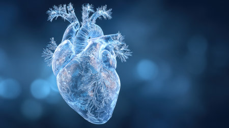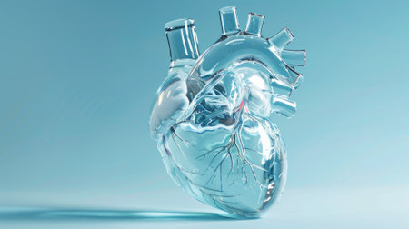 transparent heart sculpture on a clean blue background, intricacies of cardiac health through expertly designed glasswork.