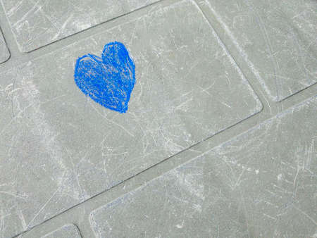 A blue heart clumsily drawn in chalk by a child's hand on a gray-green surface of an old scratched table