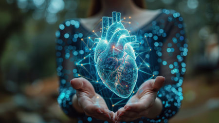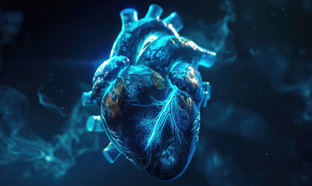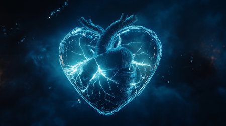 Realistic model of a human heart glowing with blue light