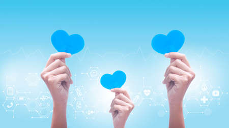 Doctor holding light blue heart shape with medical icon network connection,healthcare and medicine concept, health insurance.