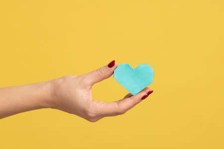 Profile side view closeup of woman hand holding tiny turquoise heart, symbol of love, showing romantic feelings. Indoor studio shot isolated on yellow background.
