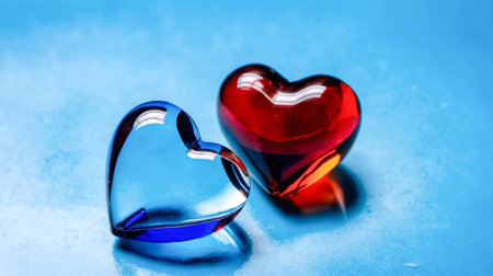 Glass Hearts Side by Side, One Red and One Blue, Reflecting Light Beautifully, Perfect for Themes of Love, Romance, Valentine Day or Any Affectionate Moment