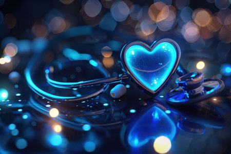 Heart shaped stethoscope glowing with blue light on a reflective surface surrounded by a bokeh effect of colorful lights