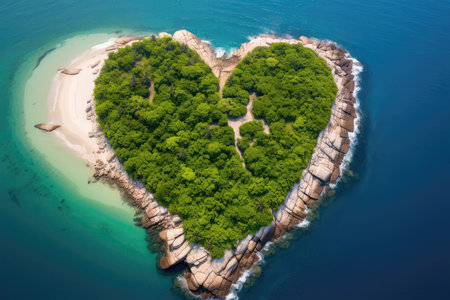 Aerial View Of Heartshaped Island With Sandy Beaches, Surrounded By Rocks And Tropical Vegetation Incorporates Technology