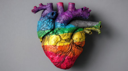 An anatomical model of a heart is presented with a vibrant rainbow color scheme. The object is composed with a focus on its form and textures, illuminated by diffused light. The image suggests a conceptual representation suitable for diverse educational or illustrative purposes.