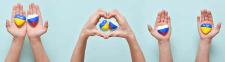 Horizontal banner with children's hands and hearts with flags of the countries of Russia and Ukraine. The geopolitical conflict.