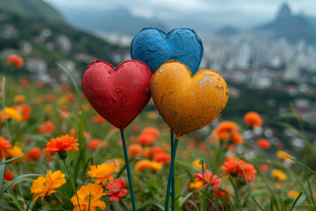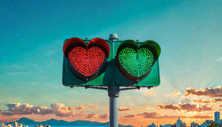 Heart-shaped traffic lights stand out against a picturesque sky and mountainous horizon, merging urban elements with natural beauty. AI generation