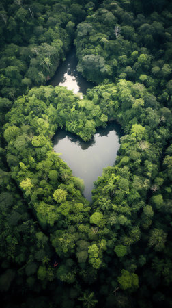 An overhead shot reveals a heart-shaped clearing carved into a lush, green forest. The scene presents a textured surface, possibly earth or rock, with variations of green foliage. The composition and lighting suggest a daytime setting, suitable for illustrating natural beauty or environmental themes. Ideal for various commercial applications.