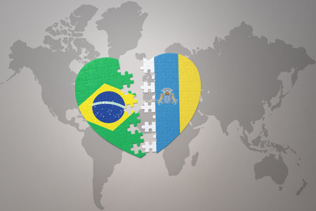 puzzle heart with the national flag of brazil and canary islands on a world map background.Concept. 3D illustration