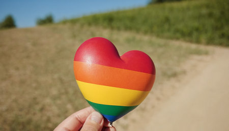 Rainbow Heart, lgbt rights concept, hand holds a heart painted like a LGBT flag, silhouetted against sun