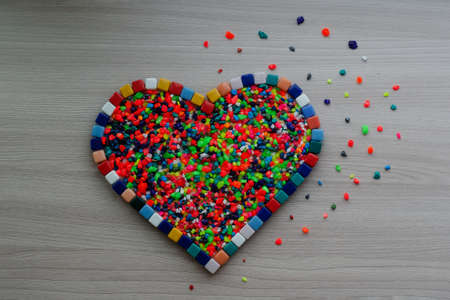 A heart symbol created using tiny colorful beads, arranged on a simple white surface.