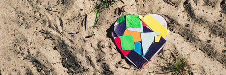 Green and blue Earth-patterned heart embroidery on sandy beach, positioned to the left with copy space on the right. Natural light, perfect for Earth Day and eco-friendly concepts.